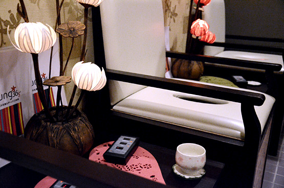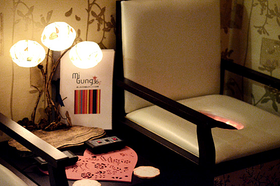 一般的なよもぎ蒸しは、よもぎの葉っぱを入れた鍋を直接イスの下に置くだけなので、せっかく体から出た老廃物がまた体に吸収されてしまう等の衛生的な問題がありますが、ここ「美宮」のよもぎ蒸しは違います。王妃のような座浴タイプで、座浴と足浴を同時に行う半身浴スパシステムで、遠赤外線、乾式、湿式システムが付いています。