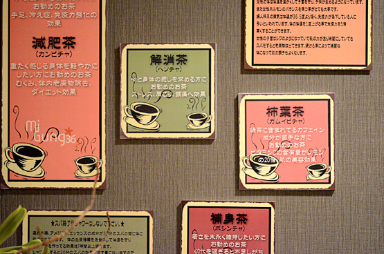 カウンセリングにより9つの痛み改善(生理痛、夫婦円満、循環、排出、ダイエット、弾力皮膚、子宮保護)より、自分の悩みに効くエッセンスを選びます。エッセンスは全て韓方薬です。その後、韓方茶テラピーとしてお茶が運ばれてきます。ストレス解消茶・ダイエット効果のあるカンビ茶、冷えに良い保温茶、ビタミン豊富な柿の葉茶、体力補強の捕身茶があります。