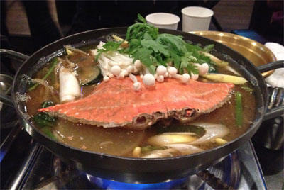 続いて出てきたのは…「ワタリガニ鍋」と「絶品トマトプデチゲ」。蟹と野菜たっぷり、味噌ベースで素材の味が出尽くしたやさしいお味の「ワタリガニ鍋」。