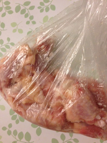 2.ビニール袋に鶏肉と下味用のマッコリを入れて揉み込む。