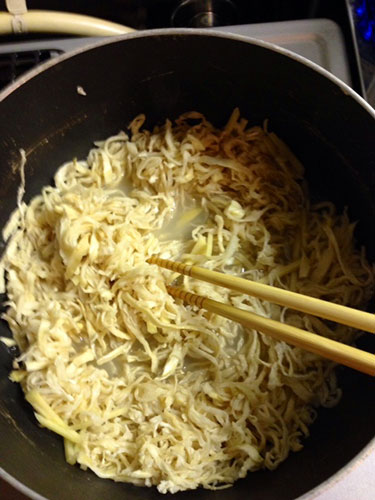 6.鍋に切干大根、水、しょうが、マッコリを入れて火にかける。