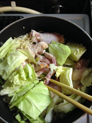 7.煮立ったら鶏肉、ベーコン、キャベツを加えて2~3分煮る。