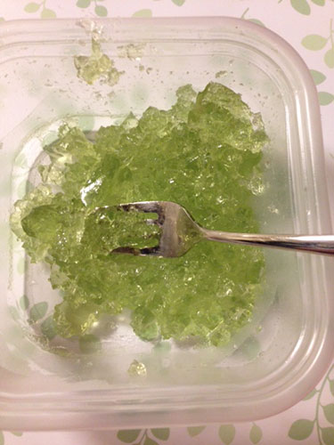 4.メロンゼリーが固まったら、フォークなどで細かく崩します。