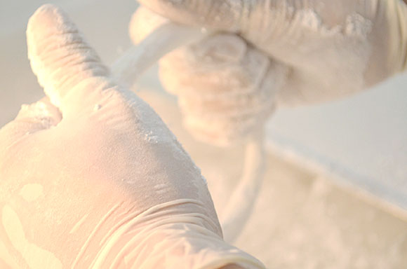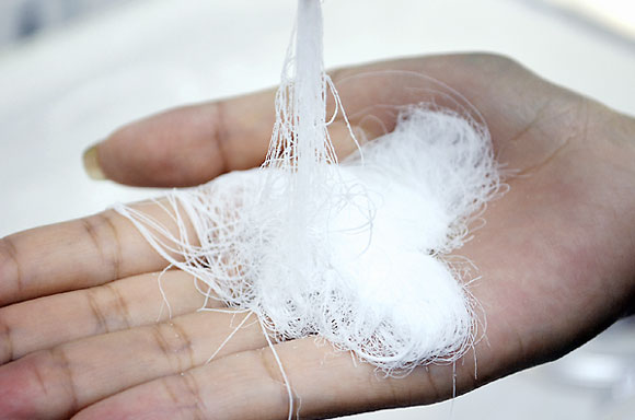 そして半分に折ってまた引っ張り2本が4本、4本が8本、8本が16本、16本が32本……と、どんどん数が増え16、384本の真っ白な糸状のお菓子が出来上がります。温度で状態が変わってくるので、素早く作るのがポイントです。