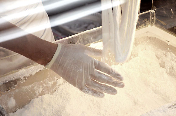 蜂蜜ともち米が入った石鹸小ぐらいの水飴を最初はドーナツ状にして、温めたトウモロコシの粉をまぶしながら、伸ばしていきます。この粉には飴どうしをくっつけない役割があります。伸ばし左右に引っ張り2本になります。