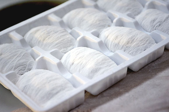 出来上がったものに、くるみ、アーモンド、ピーナッツなど7種類をすり潰した実を巻いて4cmぐらいにカットすれば「龍のひげ」が完成します。ちょうど繭の左右を切り落としたような感じです。材料は韓国の会社から輸入しているため、本場と同じ味です。