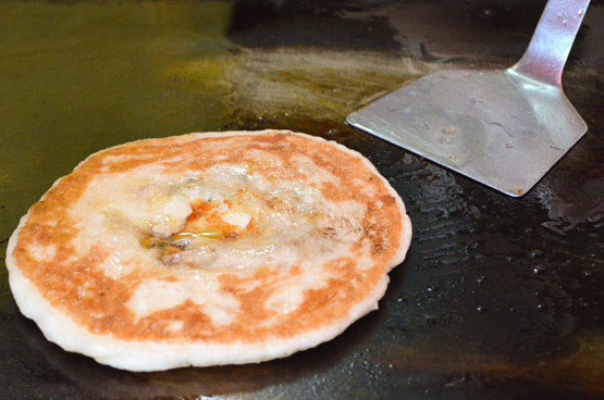 5.フライパンを温め、バターもしくはマーガリンを引きます。サラダ油やゴマ油でも構いません。フライパンの上に丸めた生地をのせヘラで潰して両面、キツネ色になるまで焼きます。これで完成です。中の具が真ん中に来ていなかったり、量が多すぎたりするとヘラで潰した時、具がべちゃっとはみ出してしまうので注意が必要です。