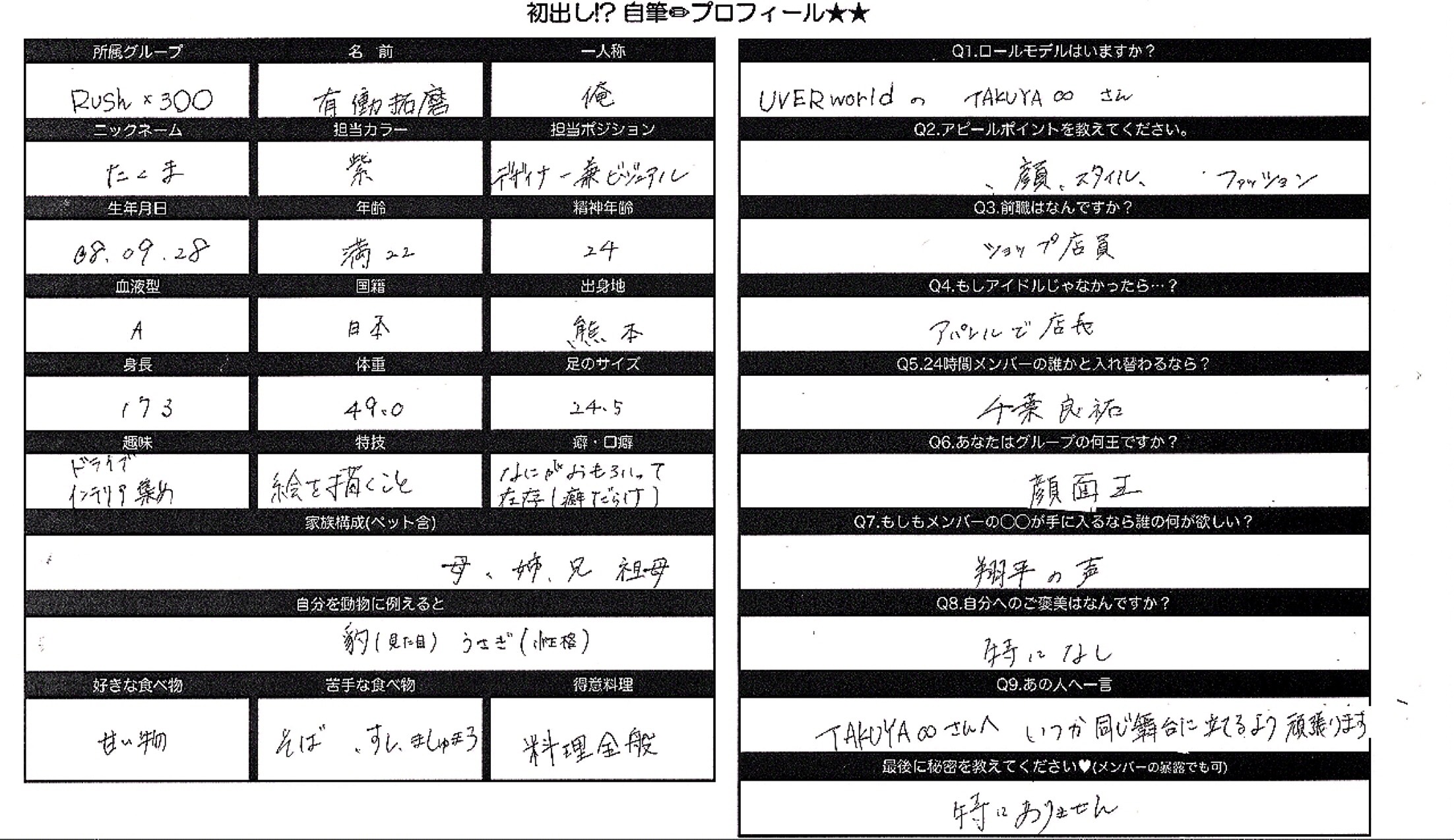 【有働拓磨 編】★ 直筆プロフィール初公開!! ★【Rush×300】