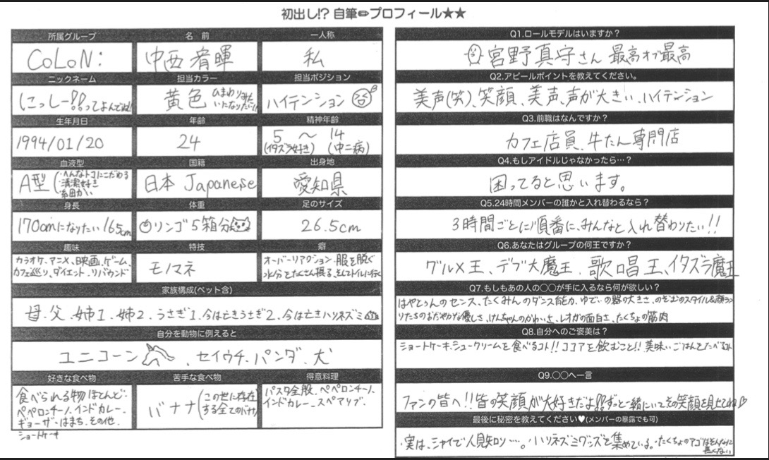 【中西宥暉】アイドル直筆プロフィール【CoLoN:】