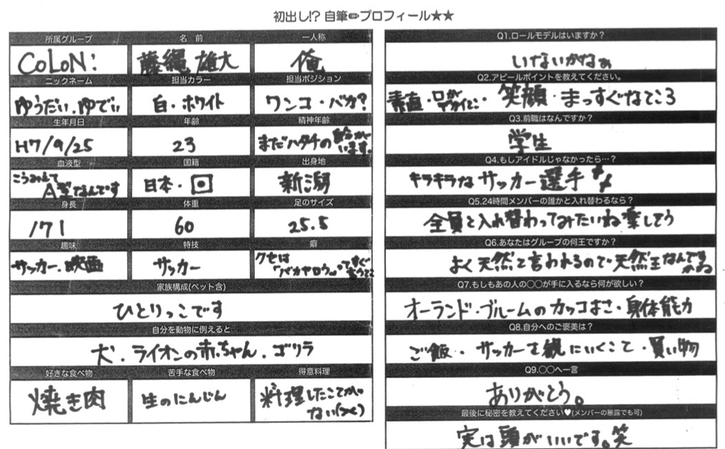【藤縄雄大】アイドル直筆プロフィール【CoLoN:】