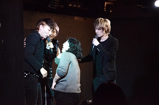 メンバーが「今日お誕生日の人いますかー?」と聞くと、会場の中に今日が誕生日だというラッキーなルミさんという方がいらっしゃいました。ルミさんをステージに上げ、メンバー4人が膝まずきバースデーソングをアカペラで歌っていました。そしてメンバーを1人選ぶように指示されます。すると…