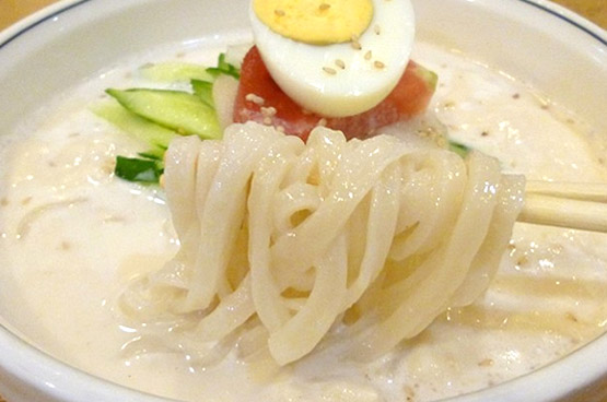 「コングクス」の「コン」は豆、「クッス」は麺を意味しています。白く濁った冷たい豆乳スープの中にコシのある麺を入れたもので、上にキュウリやキムチがのっただけのシンプルな料理です。暑い夏に多くの韓国人が好んで食するスタミナ食で、おいしいだけでなく暑さに疲れた体と心に活力を与えてくれます。自然な甘みがあり、豆乳が好きな人には好まれる味です。