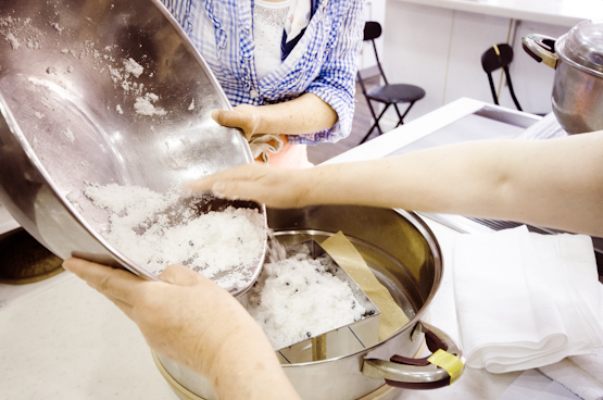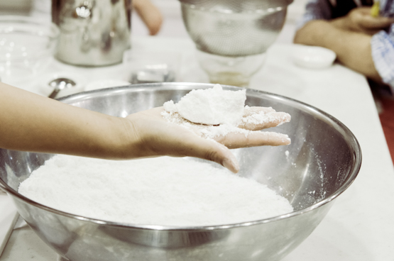 1.米粉に塩を入れて良く混ぜた後、水を混ぜてふるいに通します。