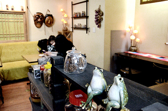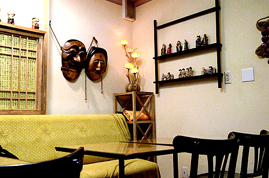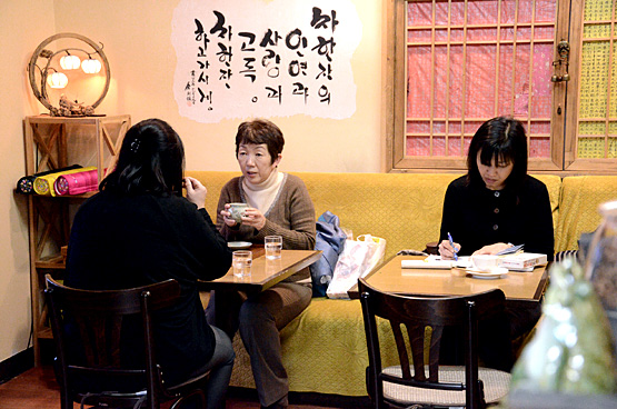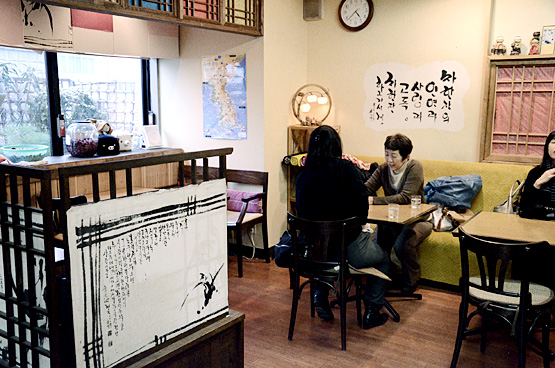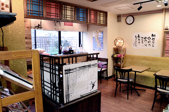 店内のハングルの書かれた壁紙や、木と紙を組み合わせたインテリアなどは、全て代表の御主人の手作りだそうで、韓国伝統の置物や壁飾りなどおしゃれで趣があります。新大久保にいることを忘れてしまうかのような、静かでゆっくりできる隠れ家的な空間です。ここに来たお客さんには、「韓国の仁寺洞にきたみたい」とよく言われるそう。自由に読める雑誌なども置いてあります。落ち着いている空間なため、お客さんの年齢層が高めでしたが、最近は若い人が増えたそうです。