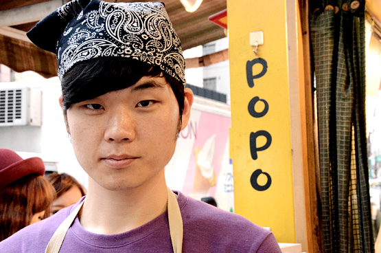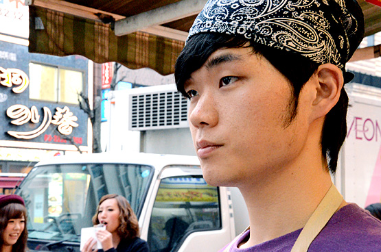 「POPO屋台」で働いている“キム・ジンヨン”さんは、天ぷらのために日本に来た?! 韓流男子です。韓国のソウル出身で、身長183センチ、来日歴は2か月、年齢は87年12月17日生まれの24歳です。来日のきっかけは料理の専門学校への進学のためで、現在は、日本語学校に通っています。趣味はカラオケで、XJAPANをよく歌います。特技は韓国の相撲(シルム)で、高校生の時選手だったそう!好きな日本料理はしゃぶしゃぶやすき焼きで、韓国料理はサムギョプサルと和牛ステーキです。「POPO屋台」のオススメ料理は、「アンコとチーズのスペシャルホットク」です。