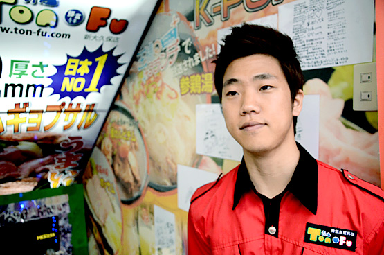 「青山TON-FU」で働いている“ジョン・ウォンベ”さんは、笑顔が可愛い~韓流男子です。韓国のソウル出身で、身長180センチ、来日歴は2年です。来日のきっかけは、日本の大学に進学するためで、日本語は韓国の塾で習っていました。趣味はギターとサッカーです。好きな日本料理はカツ丼、韓国料理はサムギョプサルです。「青山TON-FU」のオススメ料理は、「ジャガイモチーズチヂミ」です。