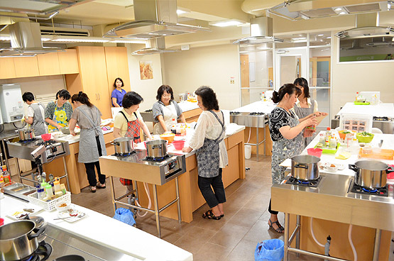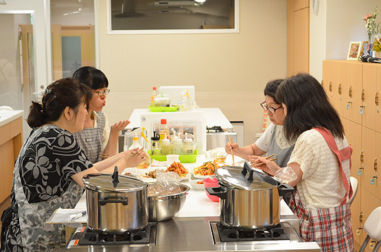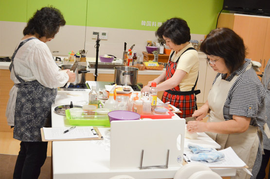 元祖韓国食材スーパーの「韓国広場」の系列店のため仕入れが安いので、受講料がリーズナブルです!入会金はなく、受講料は作りたいメニューの講座ごとに支払う単発式です。1人参加でも友達同士の参加でもOK! 1人で参加された方でも、韓国が好き、料理が好きという共通点からすぐに意気投合し、教室で仲良くなった友達と別のクラスを受講する生徒さんも多いそう。受講人数は最少4名~最大24名までで、4名以上のグループレッスンやプライベートレッスンもあります。