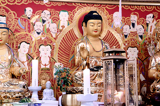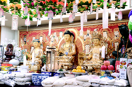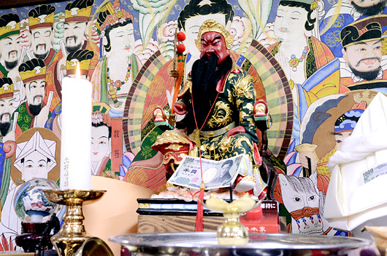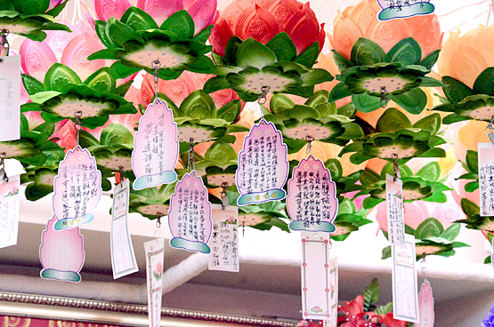 龍門精舎に入った瞬間、緊張するような神秘的な空気に包まれています。色々な神様の像や絵が飾られており、ものすごい量のお供え物が飾られています。天井には願い事がつるされた蓮の花が飾られています。
