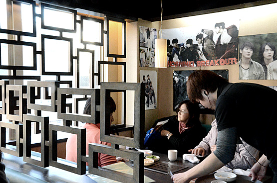 店内はゆったりしたボックス席が多く、ポスターなどが沢山貼ってあります。2FはBIGBANG、3Fは東方神起がメインになっており、ファンにも喜ばれるそう☆