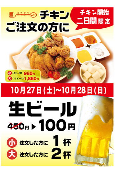 新メニュー開始を記念して10月27日(土)・10月28日(日)の2日間限定で生ビールをなんと100円※にてご提供!!この機会にぜひお試しください♪