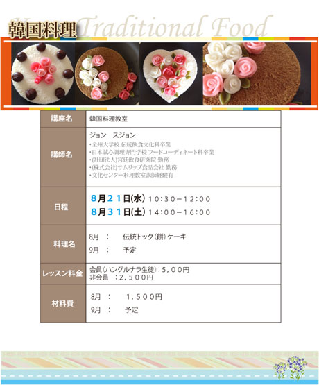 ハングルナラ 8月文化講座情報♪ ハングルナラの8月文化講座のお知らせです♪ 8月の文化講座は「ポジャギ教室」と「伝統トック(餅)ケーキ」の2講座です♪ ぜひご参加ください!! 詳細はこちら:ハングルナラ 2013/07/29 17:04 入力 一覧