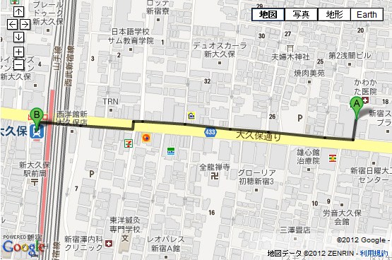 場所は新大久保駅から徒歩8分!!住所は新宿区大久保2-19-1です。
