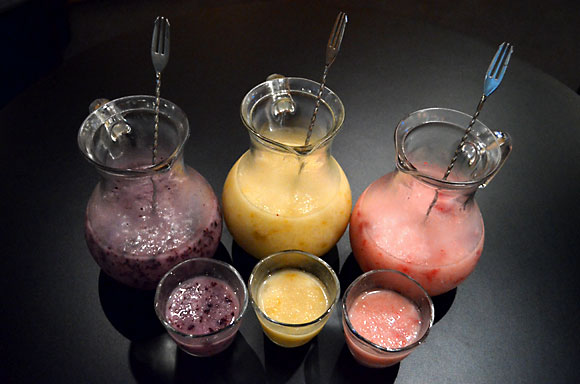 果実入りのフローズンマッコリで、ブルーベリー・マンゴー・ストロベリー・もも・梨・ココナッツの6種類。お値段は750ml 1800円です。