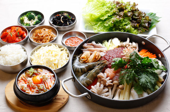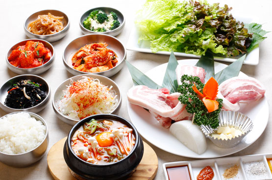 エビ、あわび、ホタテなどの海鮮とサムギョプサルが一緒に食べれちゃう贅沢な定食からチゲ、丼がずらり!