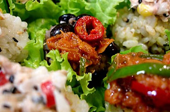 サンチュやゴマの葉などの葉野菜にご飯を乗せ、サムジャンと呼ば...