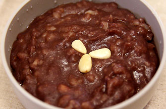 アズキ粥です。柔らかく茹でたアズキをつぶし、モチ米とともに煮...