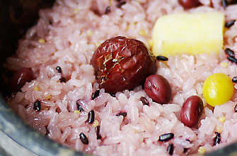 黒豆、銀杏、エンドウマメ、黒米など様々な穀類、豆類と一緒に餅...