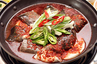 魚、または魚のあらでダシをとった辛い鍋料理で、「メウン」は辛...