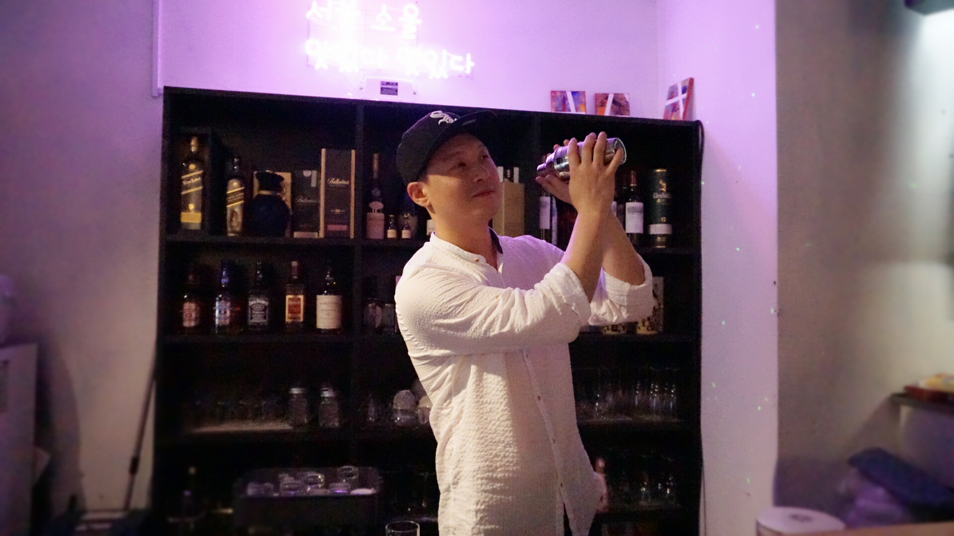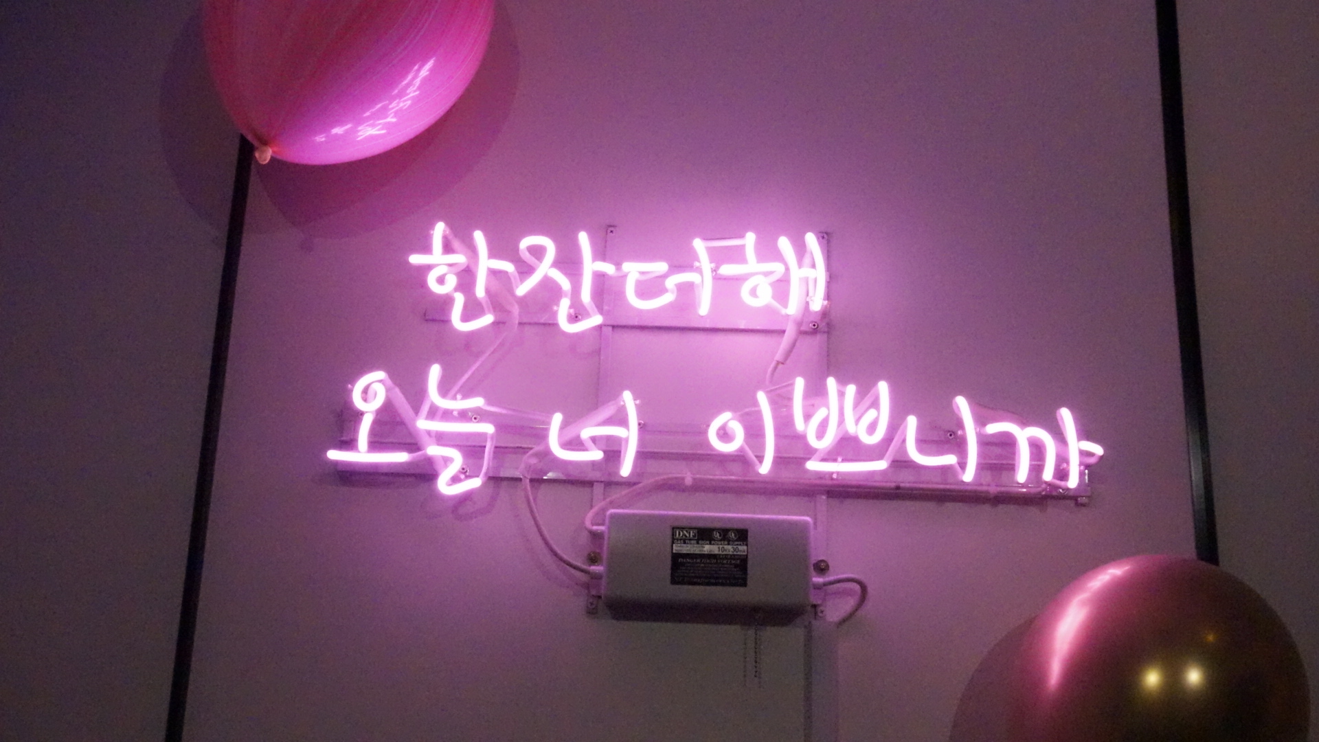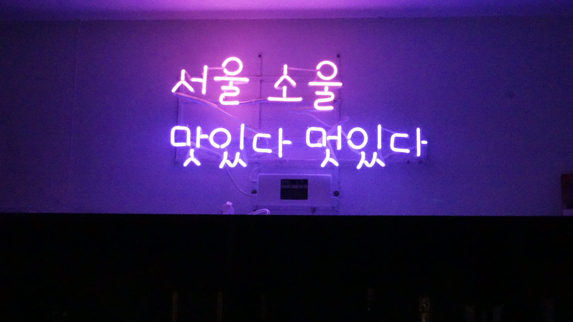清潔感あふれる店内の白い壁には「서울 소을(ソウル ソウル) 맛있다 멋있다(マシッタ モシッタ)」という韓国スタイルの言葉遊びが...♡ 薄暗い店内に光輝くネオンの光がとってもお洒落です^^ 落ち着いた雰囲気で、カクテルやワイン、シャンパンなど様々な美味しいお酒を楽しめます♪