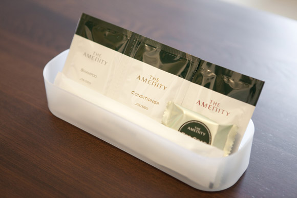 共有バスルームには、浴槽とシャワーがあります。脱衣所には鍵付きロッカーも設置され、ボディーソープ、シャンプー、コンディショナーも用意されています。